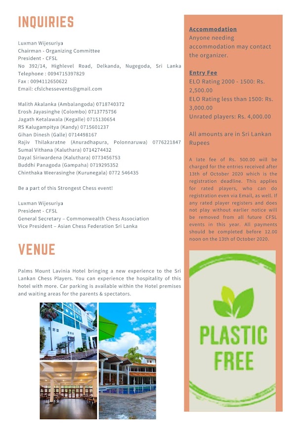 HomeChess Federation Tournament Sri Lanka Open International Rating Chess Championship 2020 Sri Lanka Chess News and Lessons October 03, 2020 0 Comments Facebook Twitter Sri Lanka Open International Rating Chess Championship 2020Sri Lanka Open International Rating Chess Championship 2020 will be held on 15th to 19th October at Palms Mount Lavinia HotelTournament Prospectus Tags Chess Federation Tournament Facebook Twitter